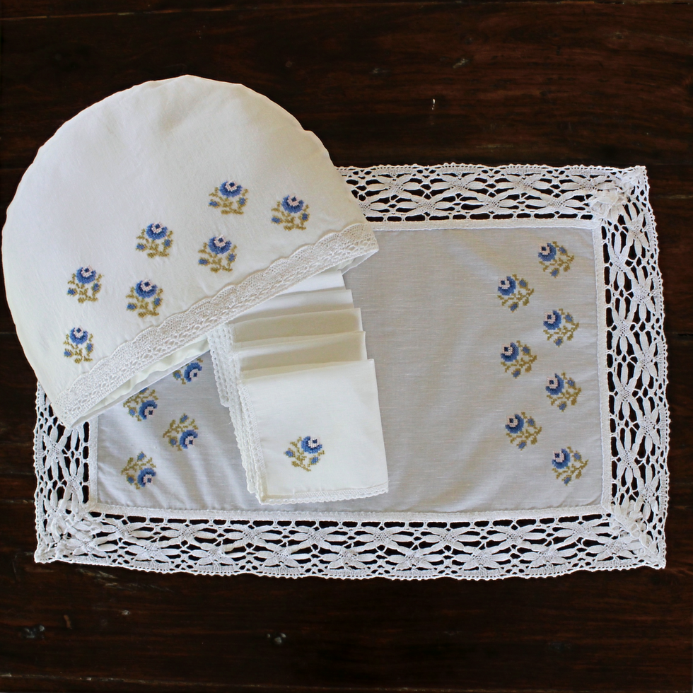 Blue-Rose Embroidered Tea Linen (hand-woven)